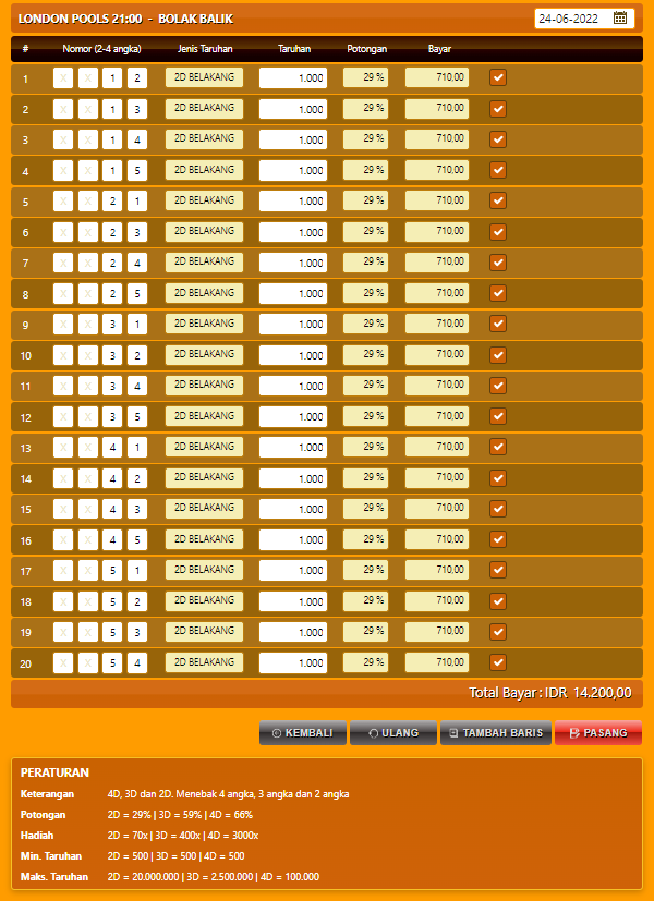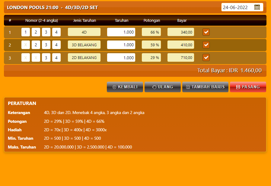 Pilih salah satu pasangan angka 2D, 3D, atau 4D. dan juga bisa memilih semua taruhan (2D, 3D, dan 4D).