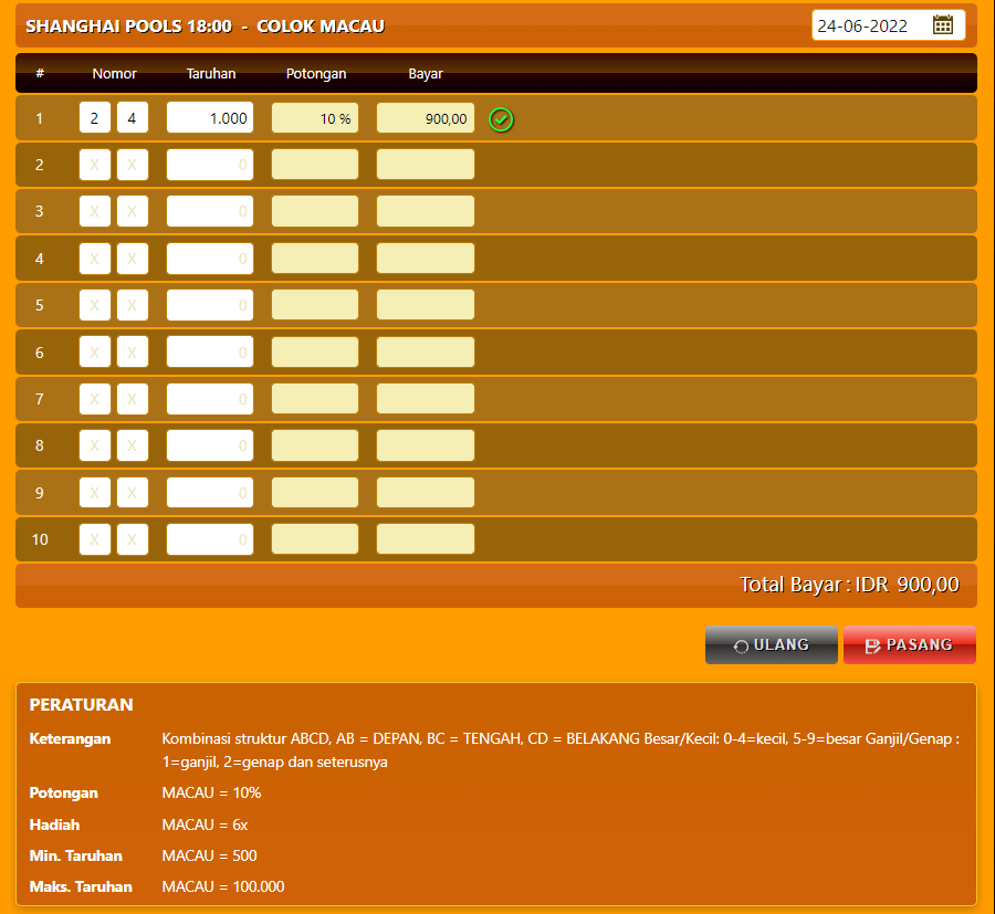 Contoh : Memasang angka 24 keluar di jam 18:00 ( shanghai pool), Dengan taruhan Rp1.000, mendapatkan potongan sebesar 10%. Yang mesti angka anda yang keluar di kombinasi 4D = 2407, 0247, 7024, hadiah yang di peroleh 6x nilai taruhan. namun jika angka keluaran nya adalah 2047 maka taruhan tersebut dinyatakan kalah.