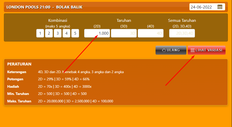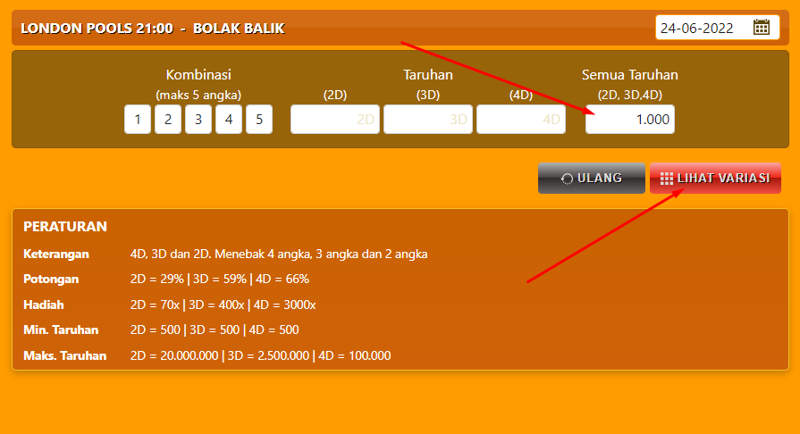Jika bertaruh pada semua pasangan (2D, 3D, dan 4D) maka bisa masukkan jumlah taruhan pada kolom semua taruhan, dan klik tombol Lihat Variasi seperti contoh pada gambar dibawah ini.