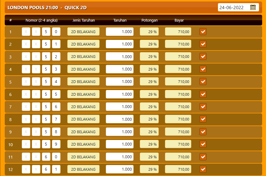 Memilih taruhan dengan tipe BESAR, masukkan jumlah taruhan pada kolom taruhan, kemudian klik tombol Lihat Variasi, otomatis pada layar menampilkan pasangan angka besar (50-99) dengan variasi pasangan 2D, seperti contoh di bawah ini.Memilih taruhan dengan tipe KECIL, masukkan jumlah taruhan pada kolom taruhan, kemudian klik tombol Lihat Variasi, otomatis pada layar menampilkan pasangan angka kecil (00-49) dengan variasi pasangan 2D, seperti contoh di bawah ini.