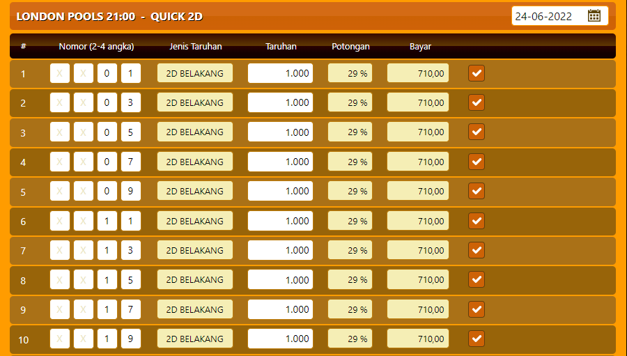 Taruhan 3 angka dan 2 angka otomatis terisi sesuai dengan kombinasi 4 angka yang dipilih.